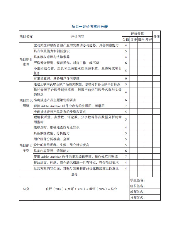 项目一评价考核评分表